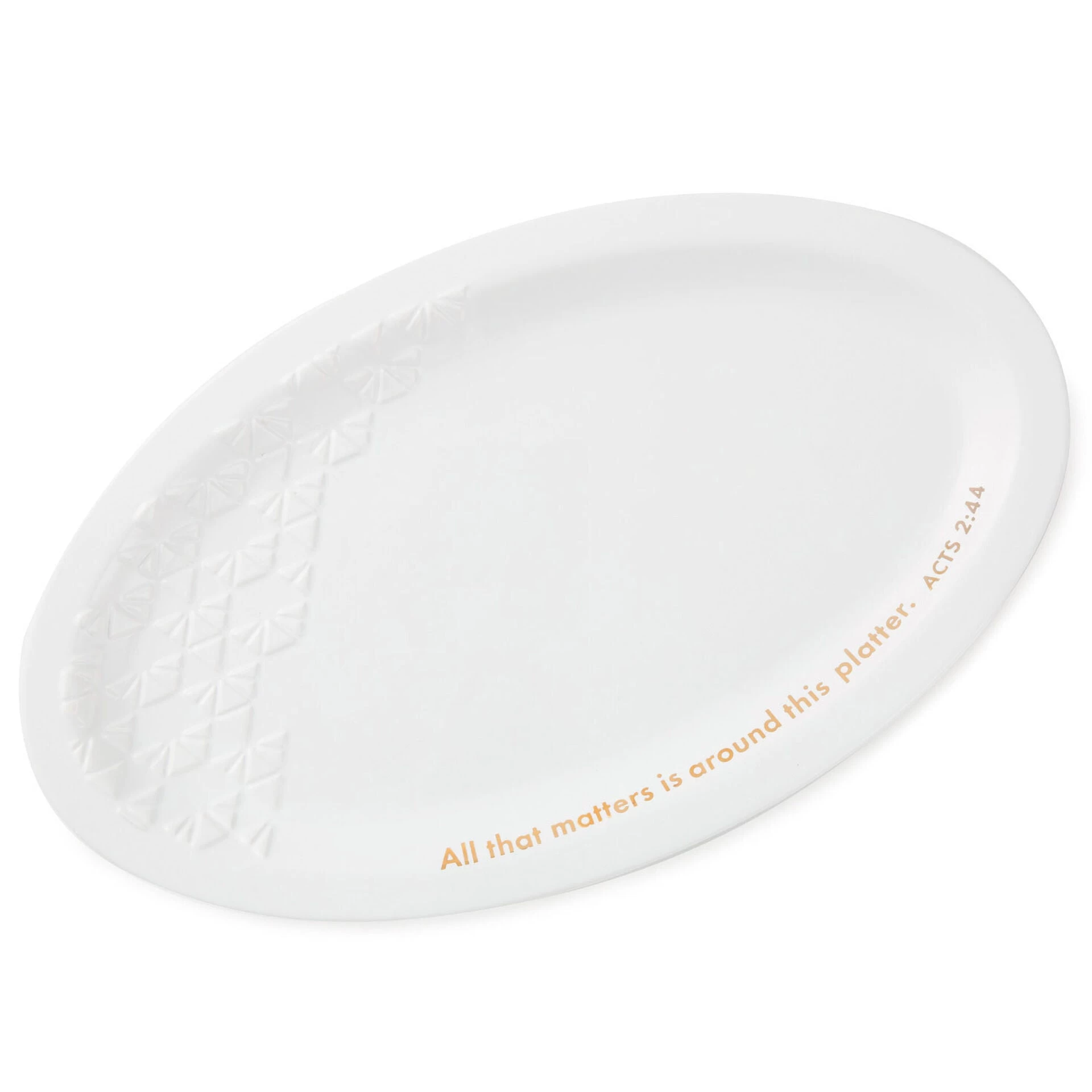Gladden your heart with this inspirational message based on Acts 2:44. This elegant oval serving platter from DaySpring’s Candace Cameron Bure collection carries a gold foil message of what really matters: friends, family and shared time at the table. A modern geometric pattern along the side of the platter makes this lovely serving dish displayable between uses.