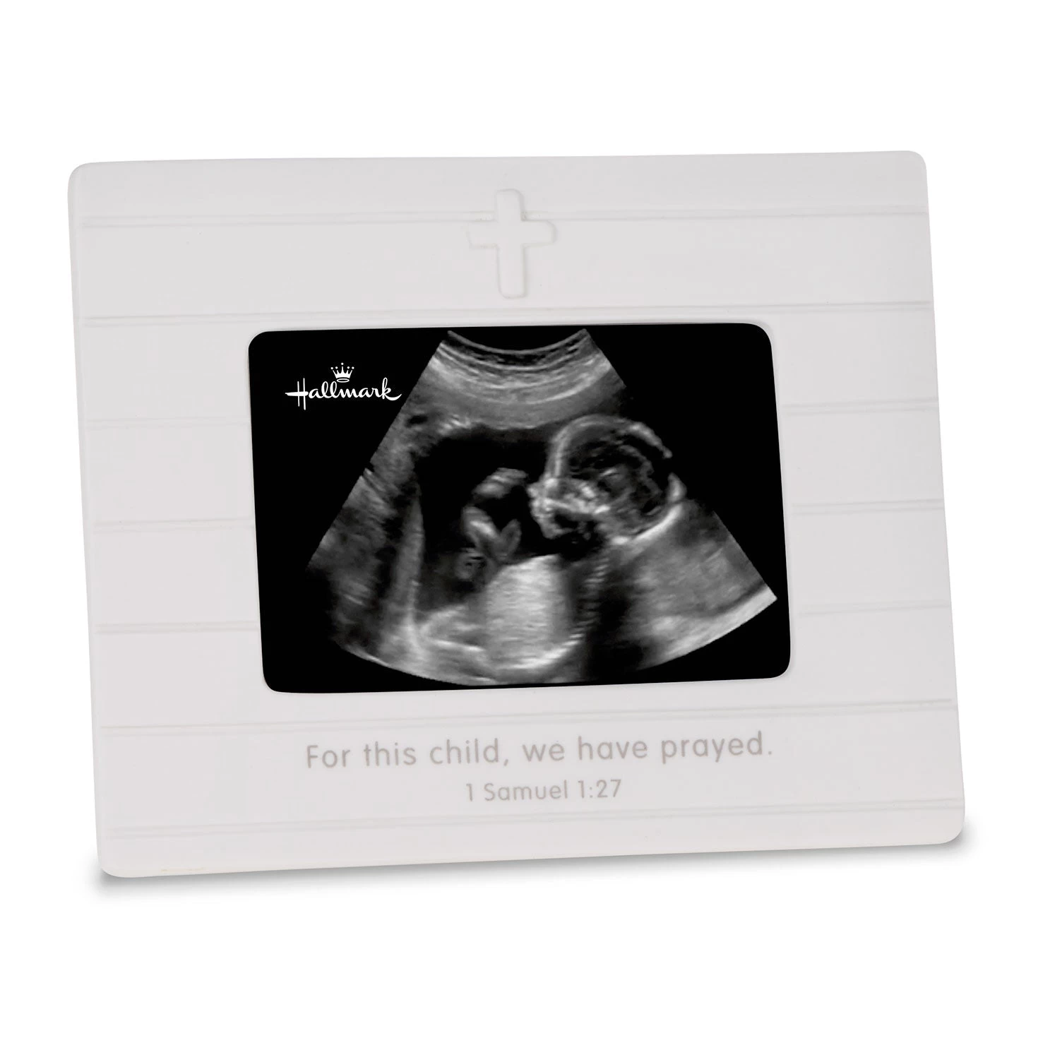 Display a memorable first photo session of the child you prayed for in this pretty porcelain picture frame, perfectly sized for a baby’s sonogram photo. The white ceramic frame features a debossed line pattern, embossed cross design on top and a Bible verse from 1 Samuel 1:27 beneath the photo.