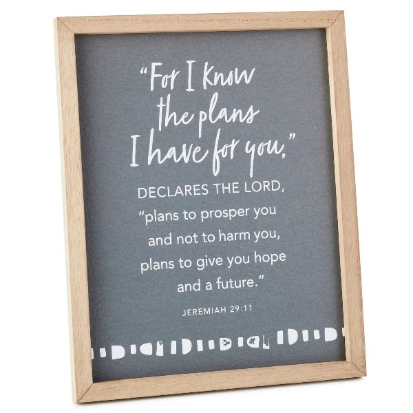 - On sign: “For I know the plans I have for you,” declares the Lord, “plans to prosper you and not to harm you, plans to give you hope and a future.” Jeremiah 29:11